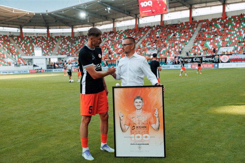 Przed meczem KGHM Zagłębia Lubin z Lechią Gdańsk stoper Miedziowych Aleks Ławniczak otrzymał pamiątkowy obraz za rozegranie stu meczów w miedziano-biało-zielonych barwach.