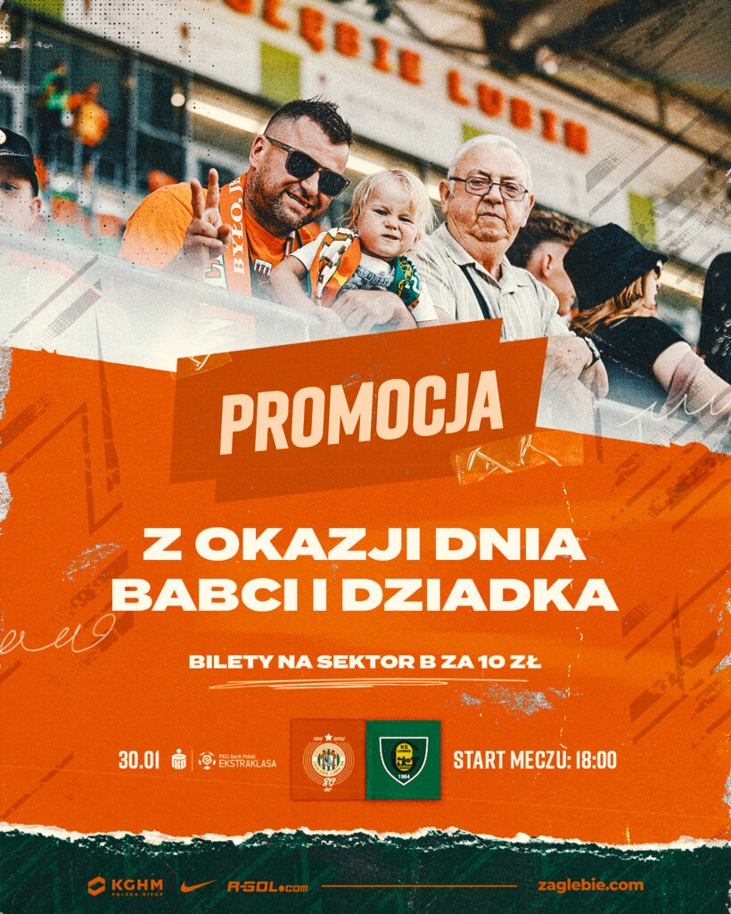 Serdecznie zachęcamy do skorzystania z promocyjnej akcji "Dziadkowie", w ramach której dzieci do 15 roku życia oraz dziadkowie powyżej 55 roku życia mogą nabyć wejściówki na mecz z GKS-em Katowice w cenie 10 zł (od 2 do 5 osób). Sprzedaż jest prowadzona stacjonarnie w FanShopie Zagłębia w galerii Cuprum Arena, a także online na stronie bilety.zaglebie.com. Promocja obejmuje sektor B i trwa do 29 stycznia.
