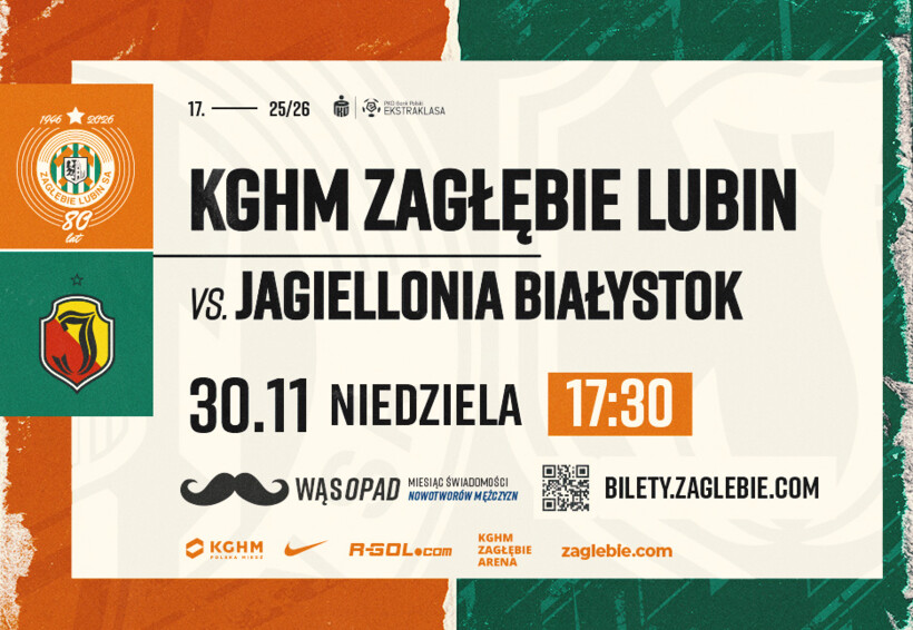 Po reprezentacyjnej przerwie czeka nas kolejne domowe starcie! W niedzielę, 30 listopada o godzinie 17:30, Miedziowi w ramach 17. serii gier zmierzą się z Jagiellonią Białystok. Serdecznie zapraszamy wszystkich kibiców do zakupu biletów na nadchodzący mecz i wspierania naszego zespołu głośnym dopingiem z trybun KGHM Zagłębie Areny! Więcej informacji znajdziecie w rozwinięciu newsa.