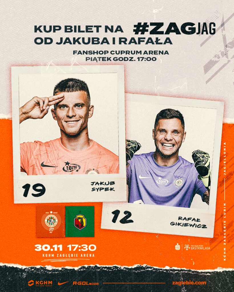 Nasz wychowanek - Jakub Sypek oraz doświadczony bramkarz z przeszłością w Bundeslidze - Rafał Gikiewicz, w piątek od 17:00 będą na Was czekać w FanShopie Zagłębia w galerii Cuprum Arena. Przez godzinę będziecie mogli lepiej poznać piłkarzy KGHM Zagłębia Lubin, a także wygrać najnowszą odsłonę kultowej serii Football Manager. Dokładnie dwunasta i trzydziesta osoba, która w tym czasie kupi bilet na nadchodzące starcie Miedziowych z Jagiellonią Białystok, otrzyma od Sypa i Gikiego wspomnianą grę.